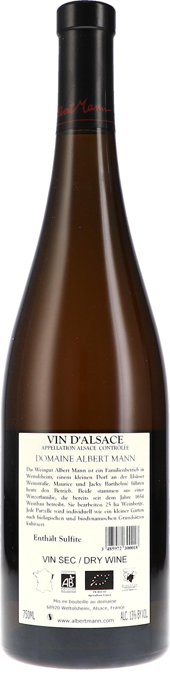 Die Domaine Albert Mann ist der Zusammenschluss zweier großer Winzerfamilien: der Familie Mann, die seit Anfang des 17. Jahrhunderts Weinbau betreibt, und der Familie Barthelmé, den heutigen Eigentümern, die seit 1654 im Weinbau aktiv sind. Gelegen in Wettolsheim an der Elsässer Weinstraße, wird jede Parzelle des 25 Hektar großen Betriebs individuell nach biologischen und biodynamischen Grundlagen bearbeitet. Der Outrevin ist ein Chasselas aus einer gut 50-jährigen Parzelle in Eguisheim. Die Trauben wachsen dort in Süd-Südost-Ausrichtung auf tonigem Kalkstein und Mergelschichten. Die Trauben wurden selektiv von Hand gelesen, und der Most wurde für zwei Monate in 750-Liter-Ton-Amphoren vergoren. Die darauffolgende Malo ist ein gewolltes Stilmittel. Der Wein wurde im späten Frühjahr nach minimaler Filtration gefüllt.