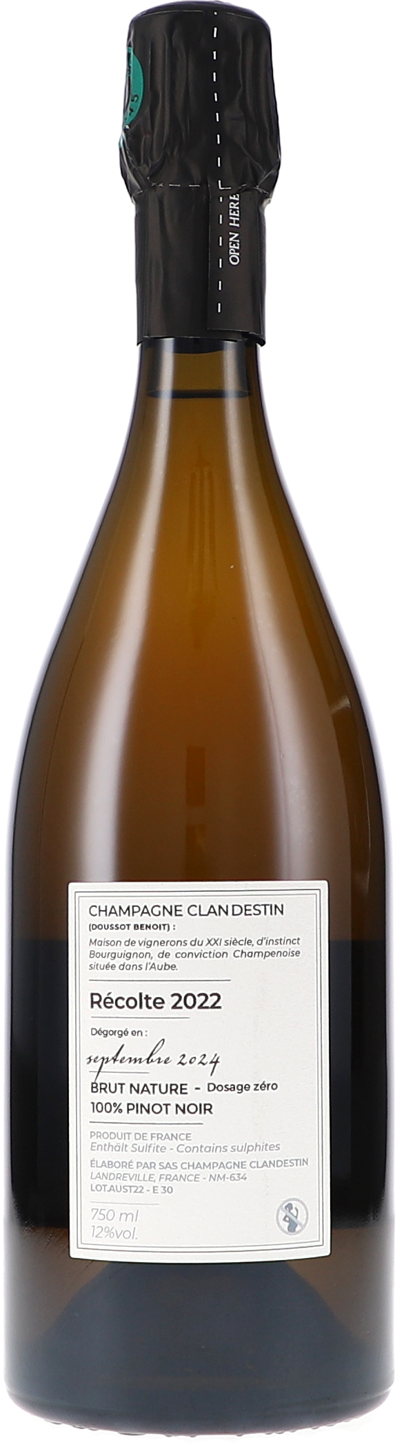 Clandestin AUSTRAL Brut Nature 2022 ist ein trockener Champagner hergestellt aus Pinot Noir Trauben in der Region Champagne in Frankreich.